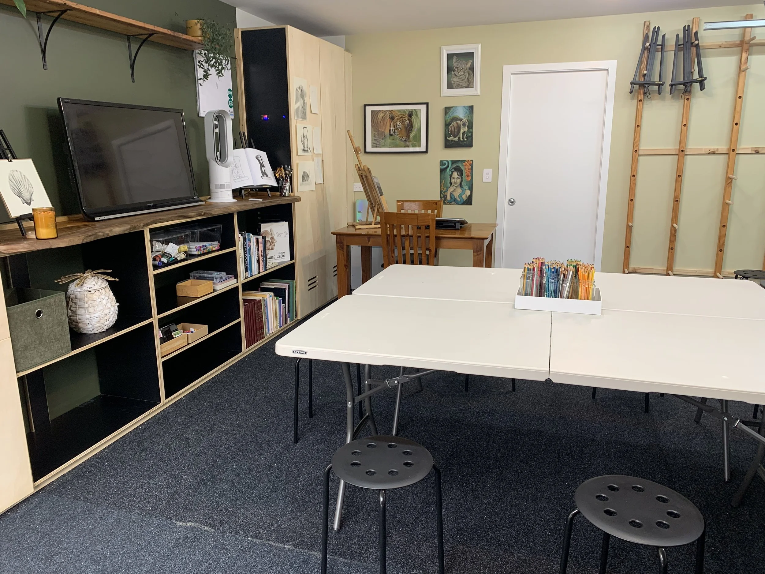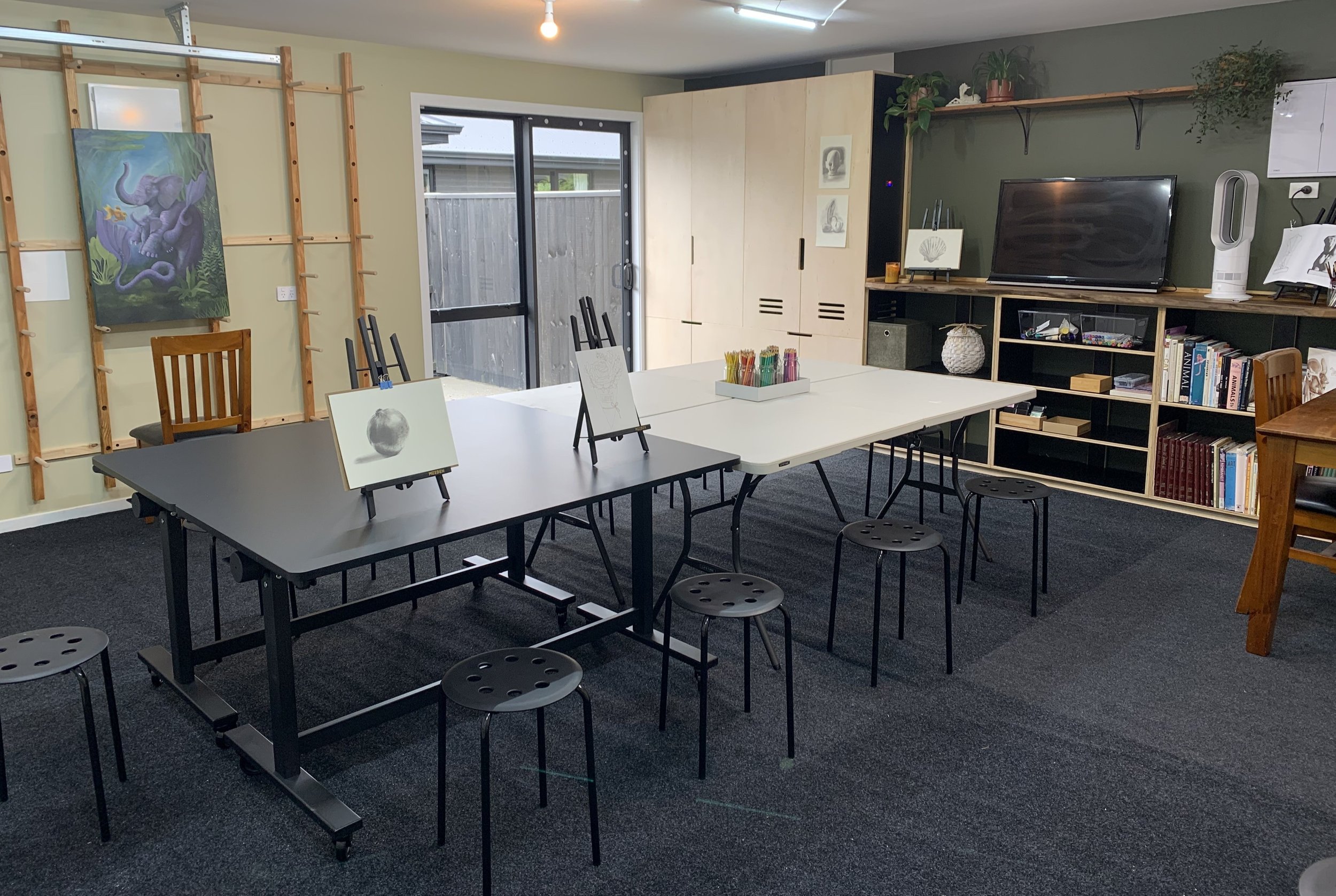 Versatile Workstations: 8 changeable wall easels for large-scale or standing work, plus table seating for up to 10 artists.